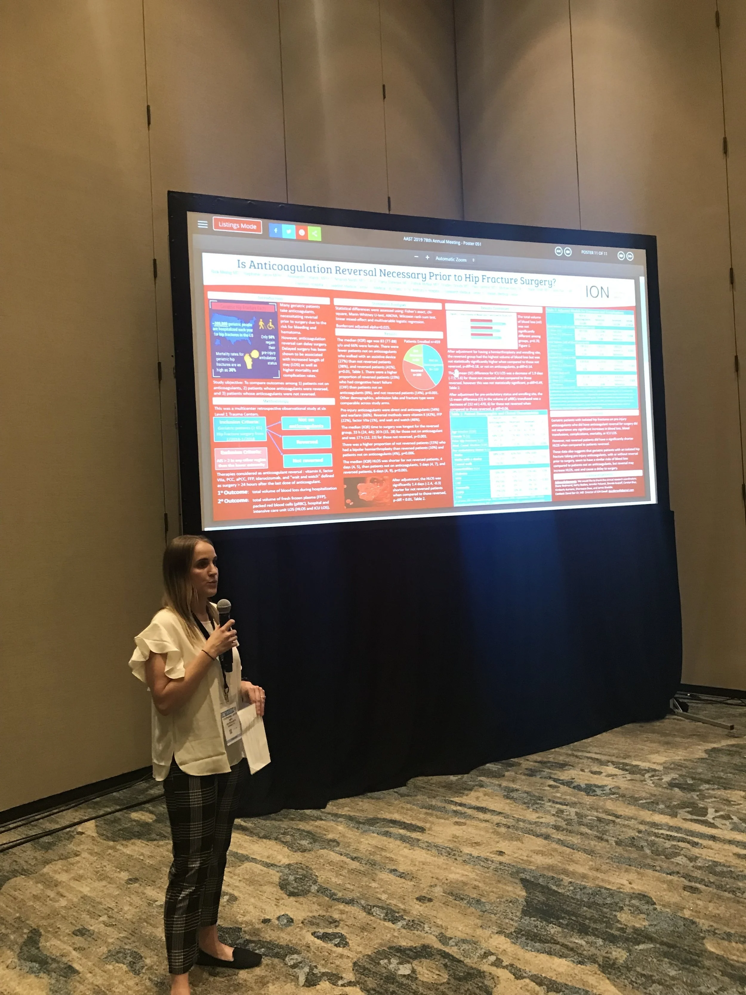 Stephanie Jarvis presents her work on anticoagulant reversal in geriatric hip fractures at the 2019 AAST annual meeting in Dallas, TX.