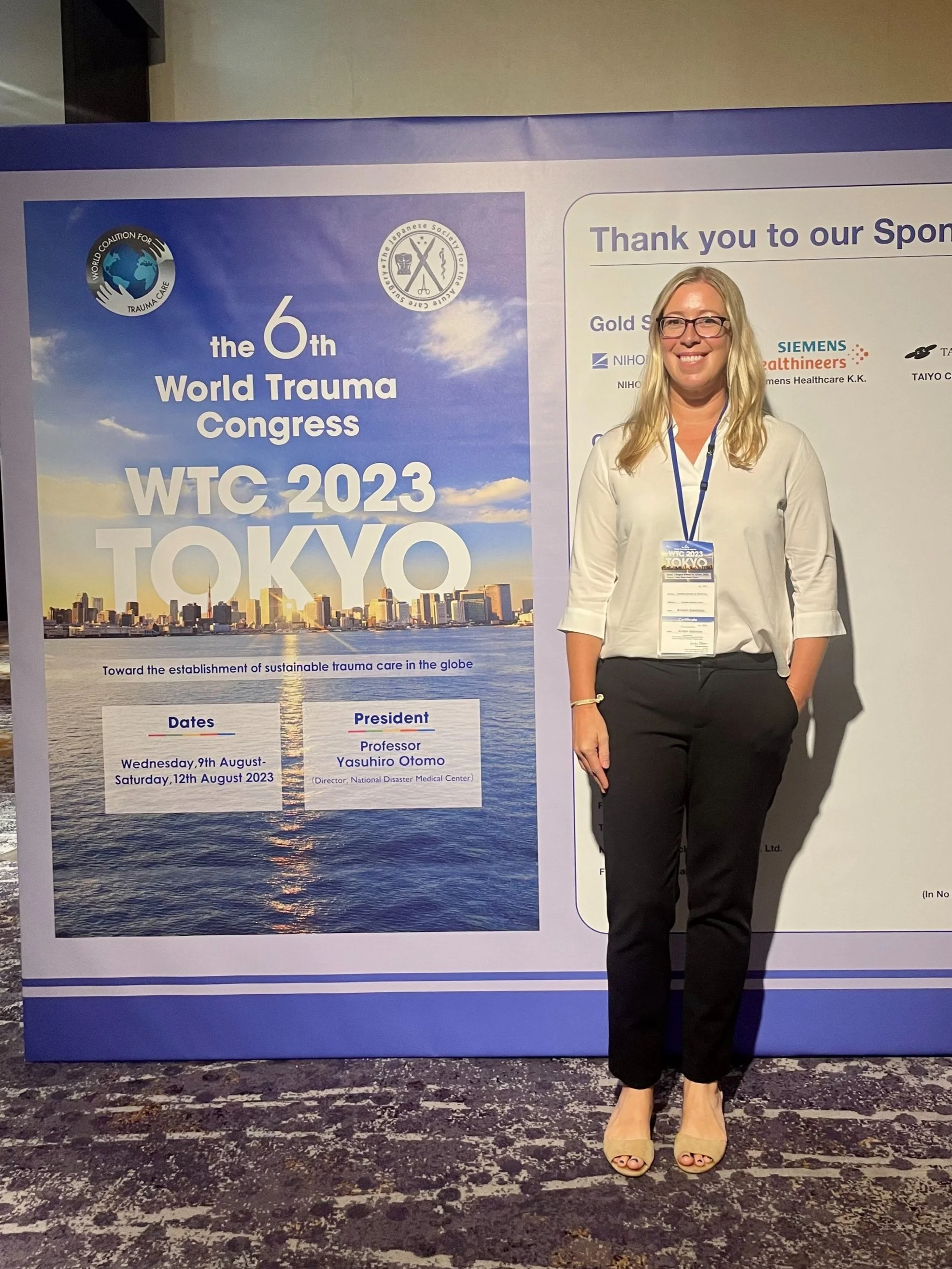 Kristin Salottolo presents her work on postoperative bleeding events in orthopedic fractures at the 2023 World Trauma Congress in Tokyo, Japan.
