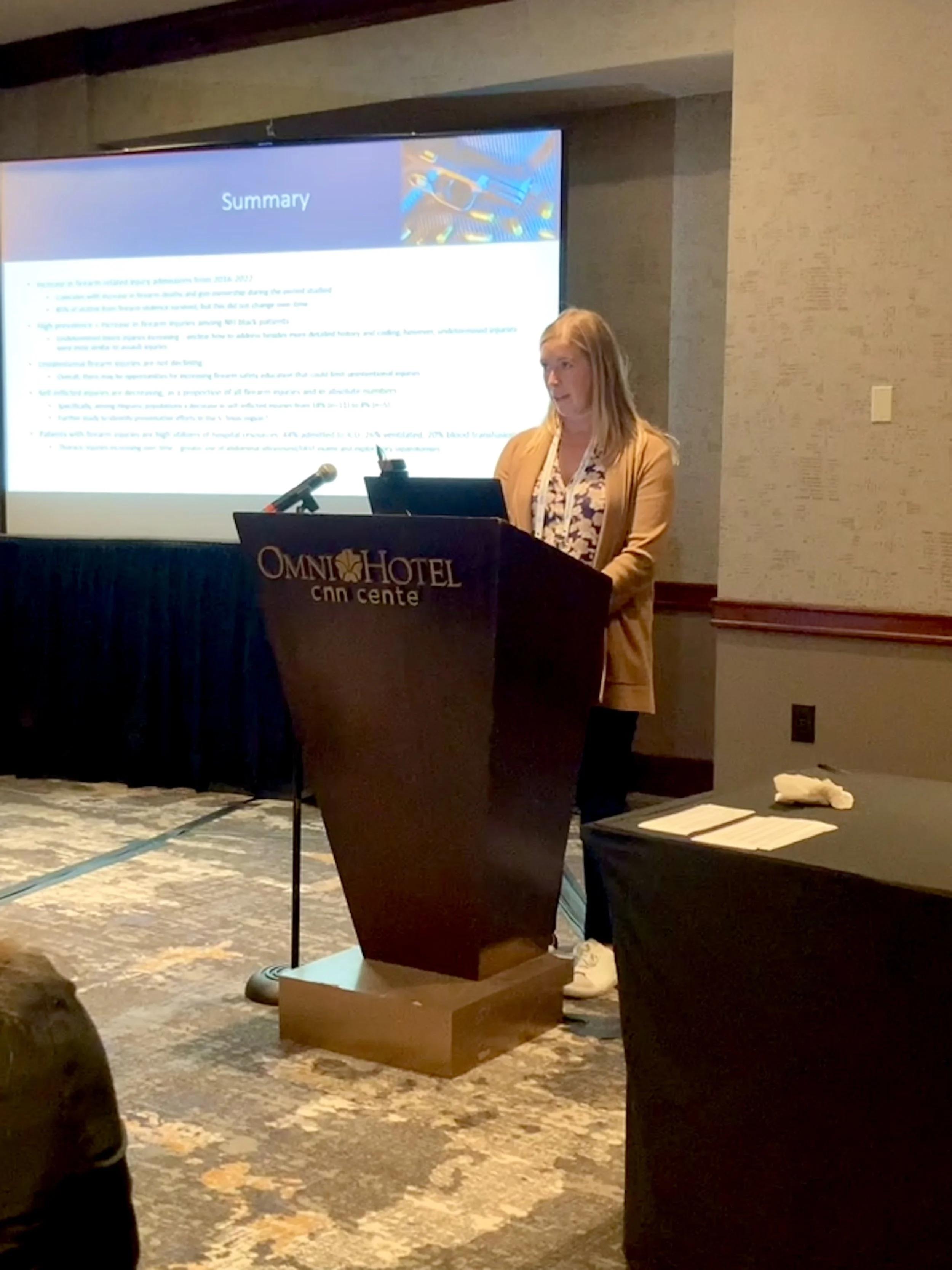 At the APHA 2023 annual meeting in Atlanta, Kristin Salottolo gives a 15 minute podium presentation on temporal trends in firearm injuries and racial disparities.