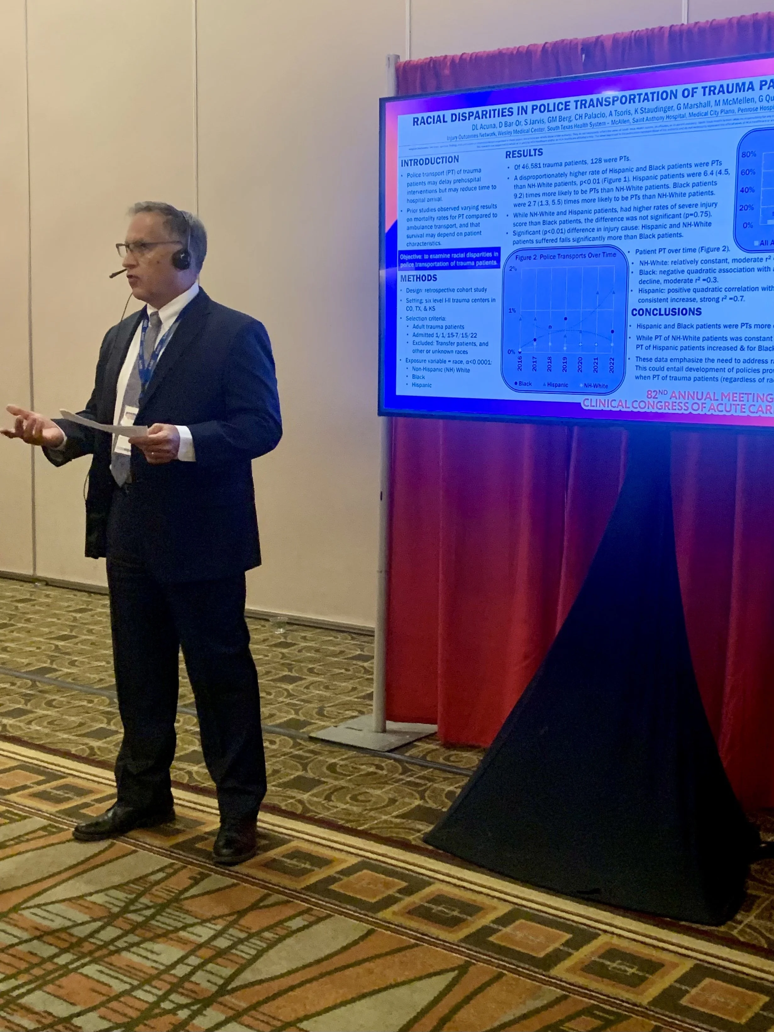 Dr. David Acuna presents a study examining racial disparities in police transport of trauma patientts at the 2023 AAST meeting in Anaheim, CA.